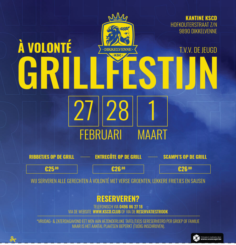 Op vrijdag 27 en zaterdag 28 februari en zondag 1 maart organiseert KSC Dikkelvenne opnieuw zijn jaarlijkse à volonté grillfestijn in Kantine KSCD. Kom genieten van heerlijk gegrild vlees, geserveerd à volonté met verse groenten, knapperige frietjes en lekkere sauzen.