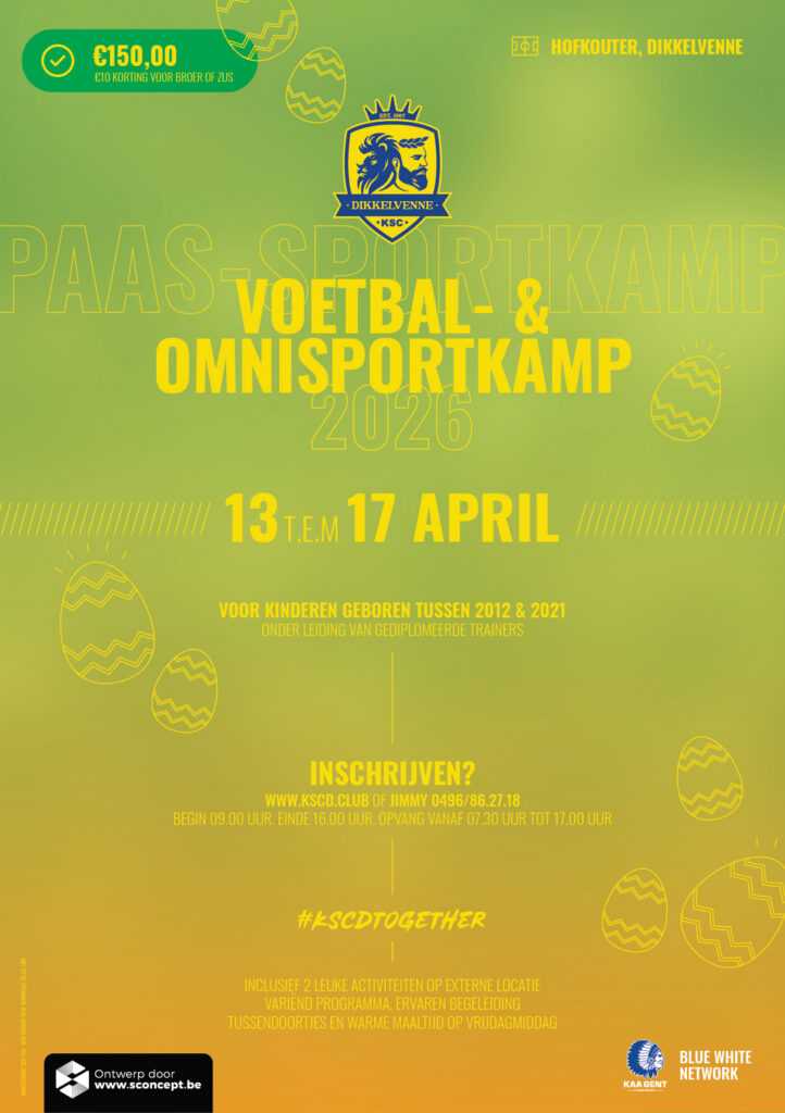 Het Paas-Sportkamp van KSC Dikkelvenne staat opnieuw klaar om kinderen een sportieve en onvergetelijke week te bezorgen. Van 13 tot en met 17 april 2026 kunnen jonge sporters zich uitleven in een gevarieerd programma vol voetbal en omnisport. Het ideale kamp voor kinderen die graag bewegen, plezier maken en willen groeien onder de vleugels van ervaren trainers.